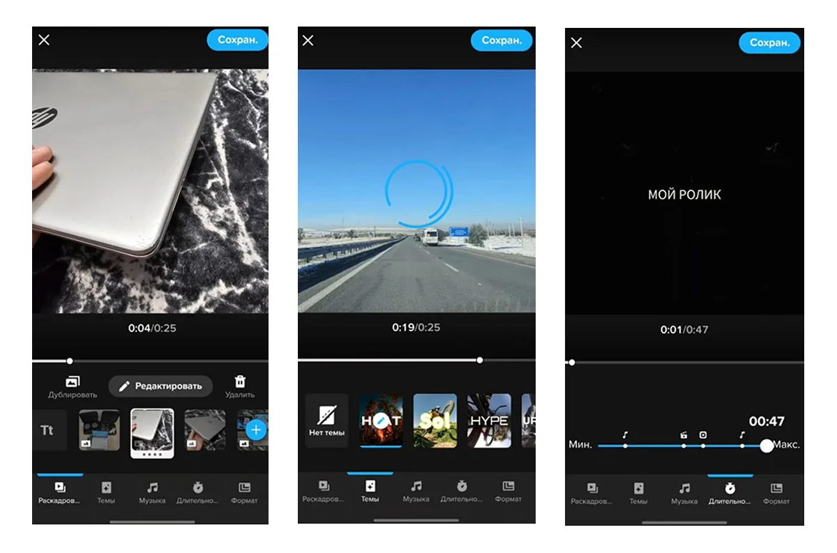 Приложение распознает лица и яркие цвета. Готовый результат экспортируется в HD 1080p или 720p при 60 кадрах в секунду. Делиться роликами можно напрямую в соцсети, а также по приватной ссылке через мессенджеры или электронной почте.